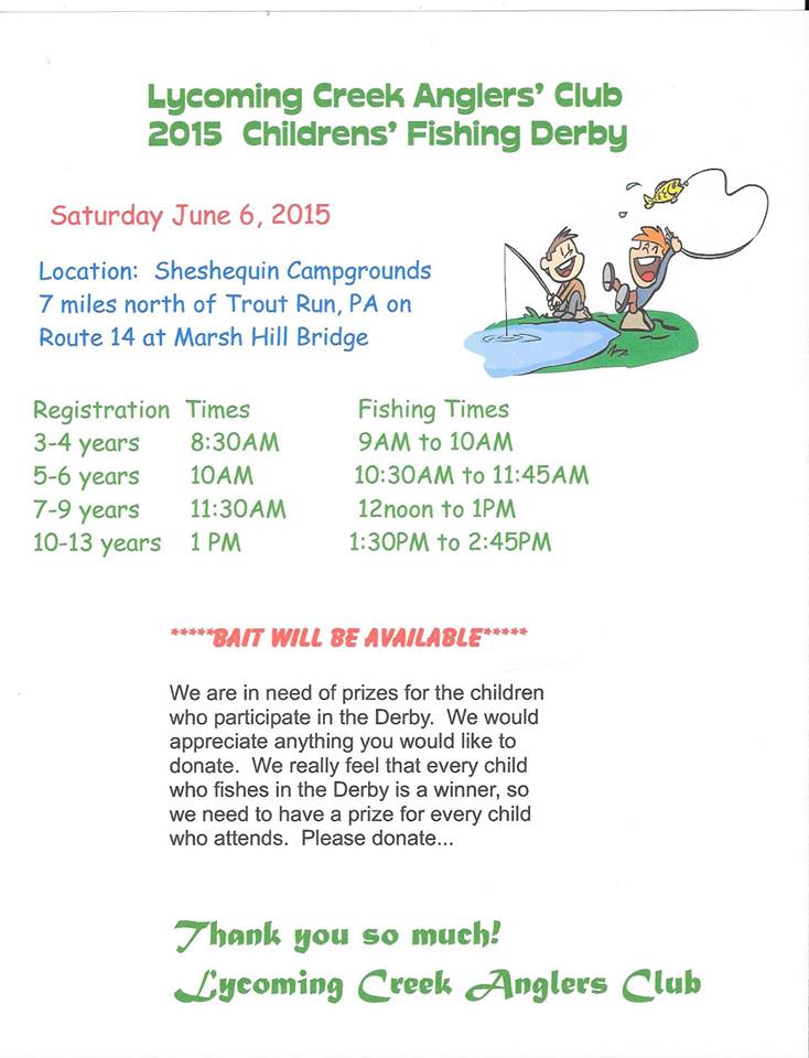 A fun Day for the kids and a great way to introduce a child to the great sport of fishing. After a look at the Lycoming Creek Anglers Club facebook page, they state that they have enough prizes for the derby.  Please visit their page and come out to the Sheshequin Campgrounds this coming Saturday and support them.  They are always in need of help and support for this derby and with their trout nursery.11295588_969410806426957_3335773870229283896_n