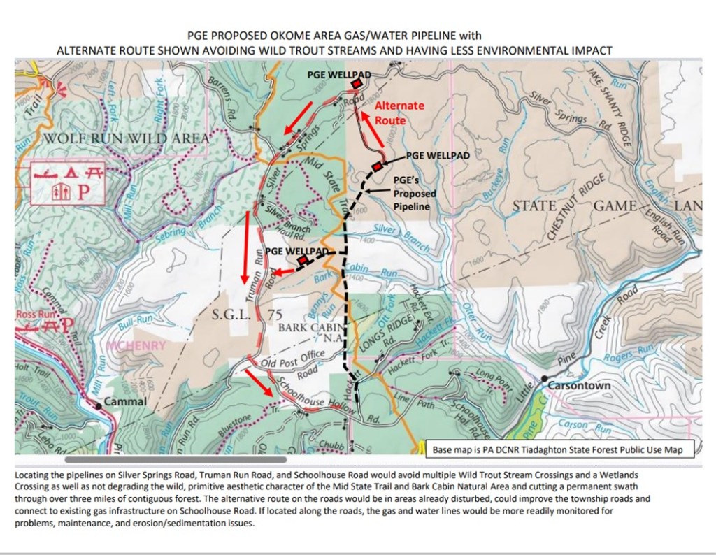 Please consider commenting on the proposal. The alternate route certainly appears to be the better option. “Locating the pipelines on Silver Springs Road, Truman Run Road, and Schoolhouse Road would avoid multiple Wild Trout Stream Crossings and a Wetlands Crossing as well as not degrading the wild, primitive aesthetic character of the Mid State Trail and Bark Cabin Natural Area and cutting a permanent swath through over three miles of contiguous forest. The alternative route on the roads would be in areas already disturbed, could improve the township roads and connect to existing gas infrastructure on Schoolhouse Road. If located along the roads, the gas and water lines would be more readily monitored for problems, maintenance, and erosion/sedimentation issues.”