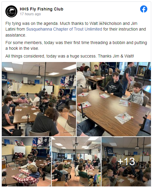 The Susquehanna Chapter of Trout Unlimited invites all fishing enthusiasts to a timely presentation for all recreational anglers and boaters by Jamie Brelsford, Water Rescue Instructor for the PA Fish & Boat Commission, Bucks County Community College and PA State Fire Academy, on water safety awareness and rescue considerations, including hands-on demonstrations of equipment. Additionally, there will be some tips on fly casting by TU members and a sneak peek at our upcoming super sale of donated fishing equipment, fly tying materials, books, and angling artwork. Themeeting will be held on Wednesday, March 8, 2023 at 7:00 pm at the Covenant Central Presbyterian Church, 807 W. 4th Street, Williamsport. Parking and entrance to the Church Fellowship Hall is at the rear of the building with access off of Campbell Street. The public is cordially invited to attend. For more information, please see our website at https://susquehannatu.com/.