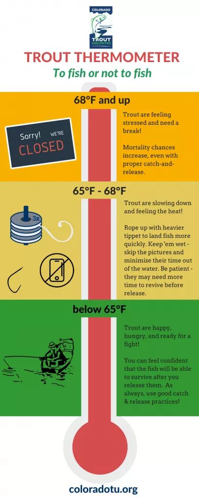 Avoid fishing in areas where trout are congregated. Actively fishing for thermally stressed trout will only add additional stress to the fish, decreasing the likelihood that the fish will survive after being caught and released.